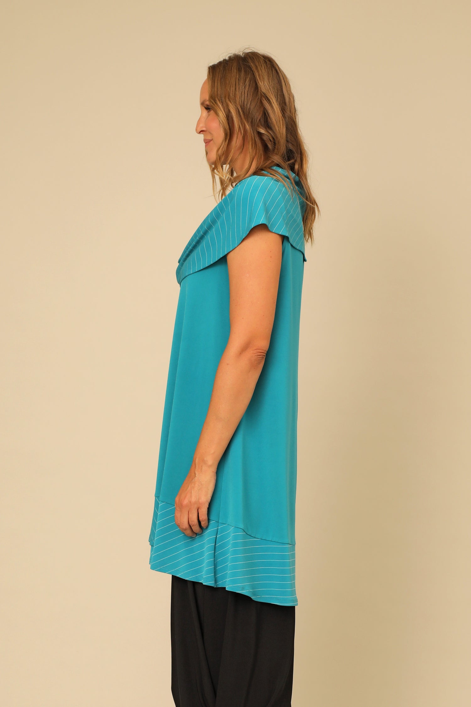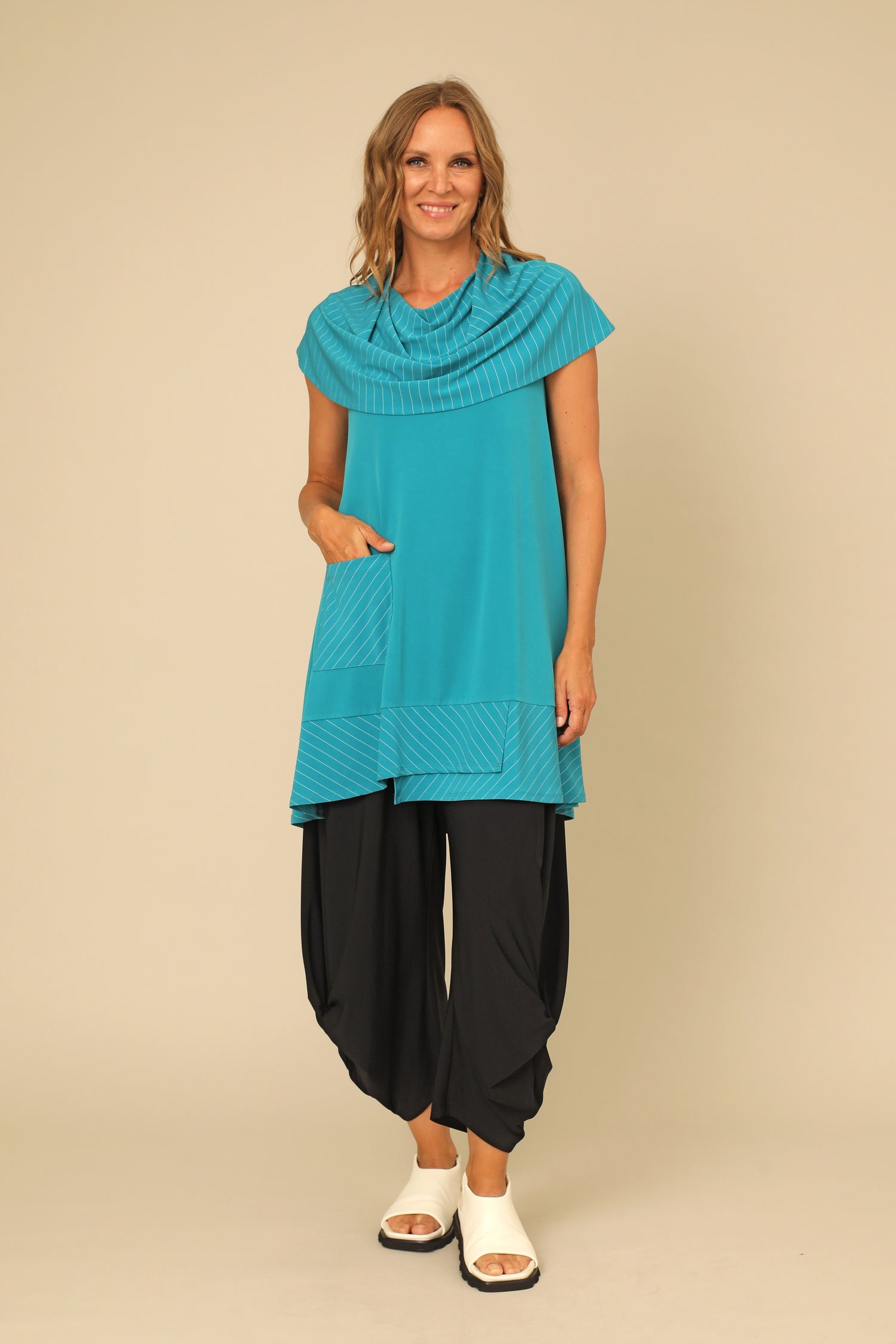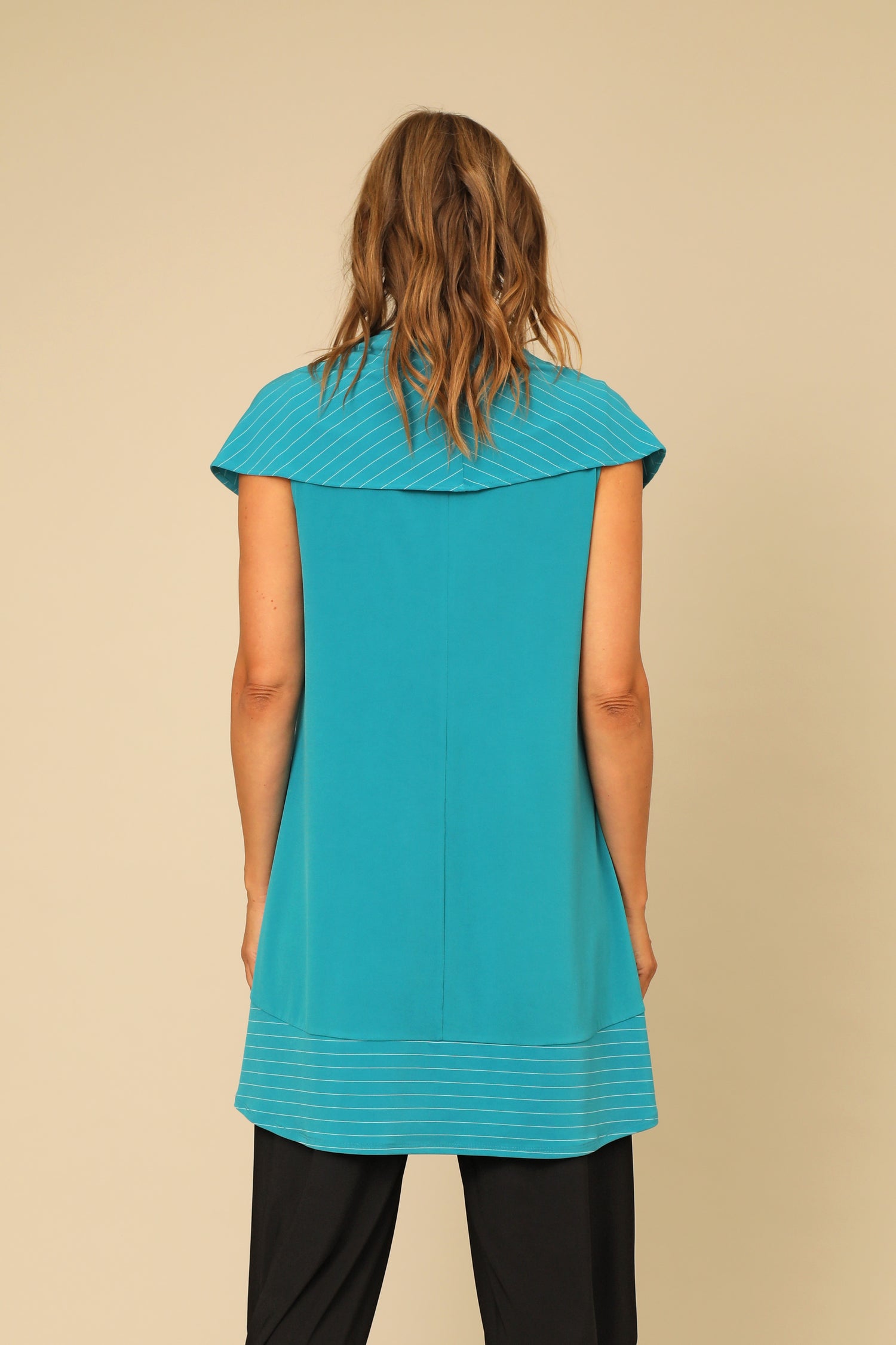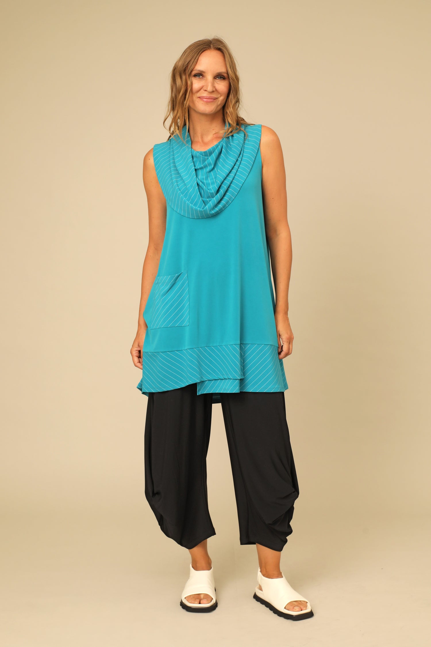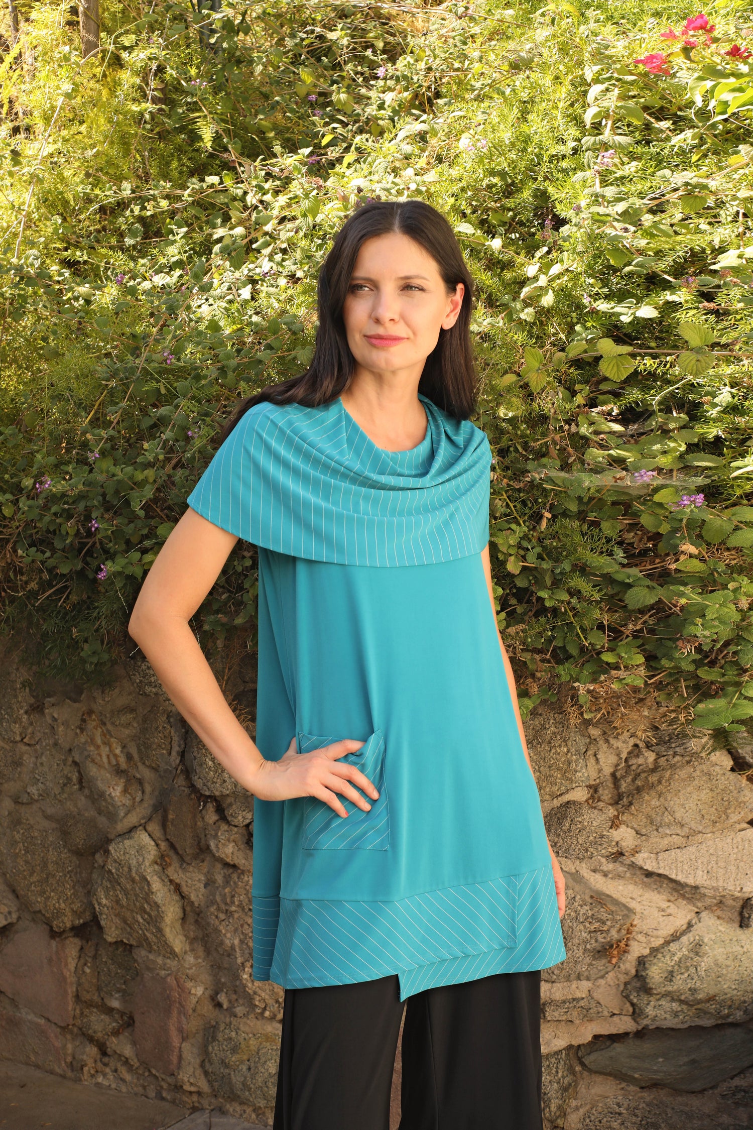 Versatile and striking, the Rhea Tunic features a wide striped cowl that can drape over the shoulders or framing the neckline. Its relaxed sleeveless body is contrasted with an asymmetrical striped hem and patch pocket. truly bold, flattering, and designed for ease in our stretchy buttery smooth fabric.