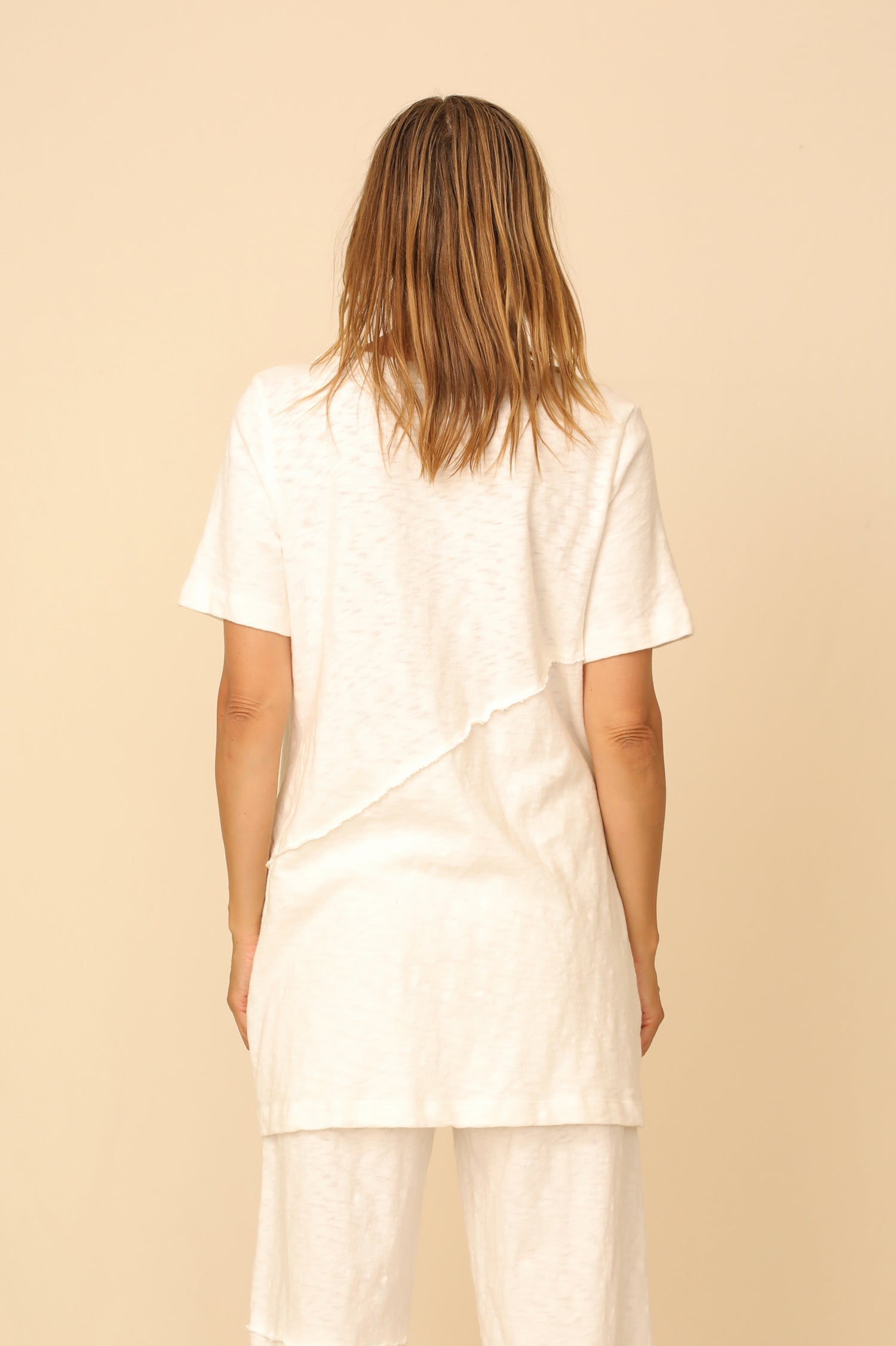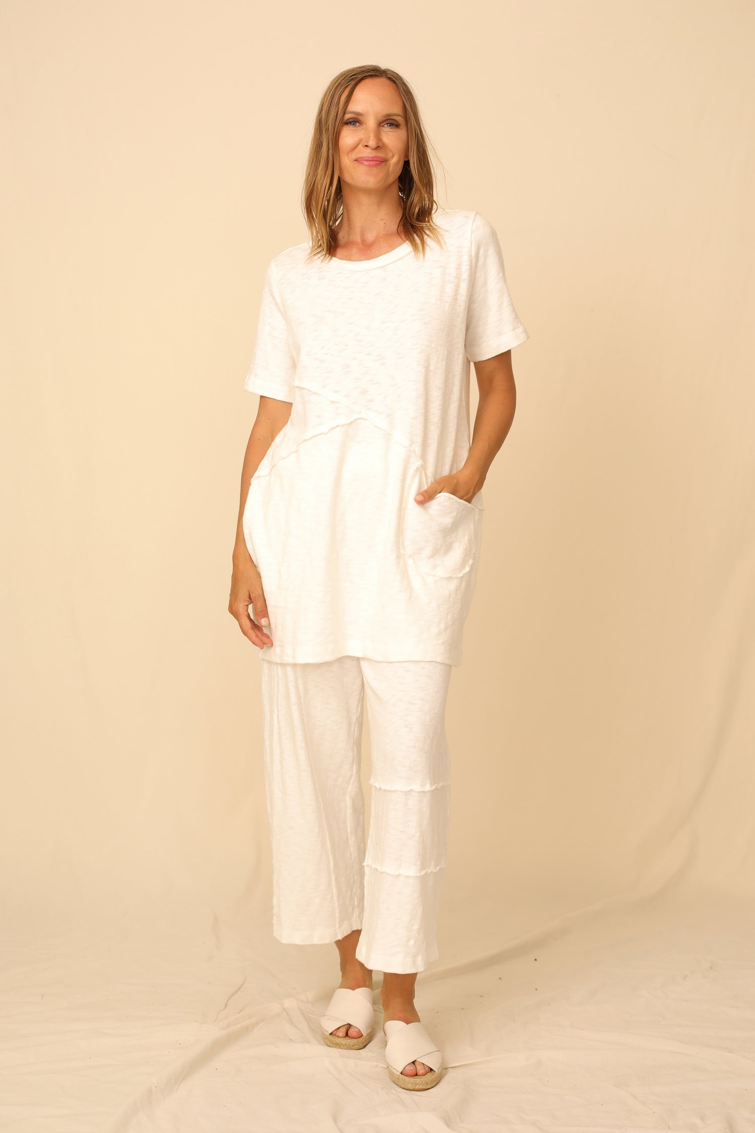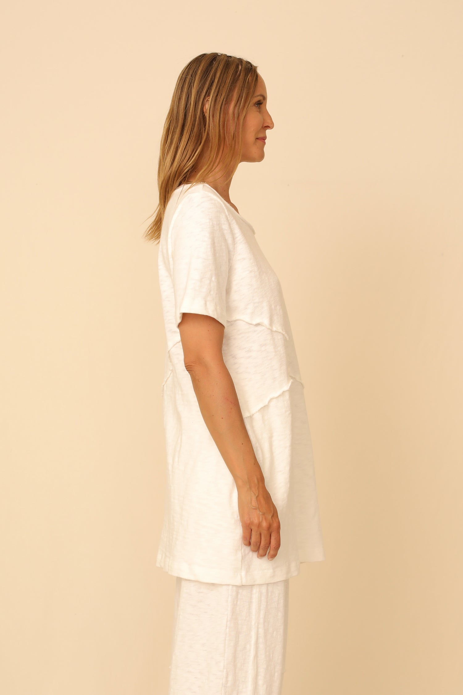 Thrown on the effortlessly wearable Ruth Tunic to experience comfort and seasonal flare. Presented with a rounded neckline, elbow sleeves, and curated in an a straight hemmed boxy fit to feel familiar. All the while beautifully detailed with raw edge flare on the asymmetric seams and unique front patch pocket in our cotton slub fabric.