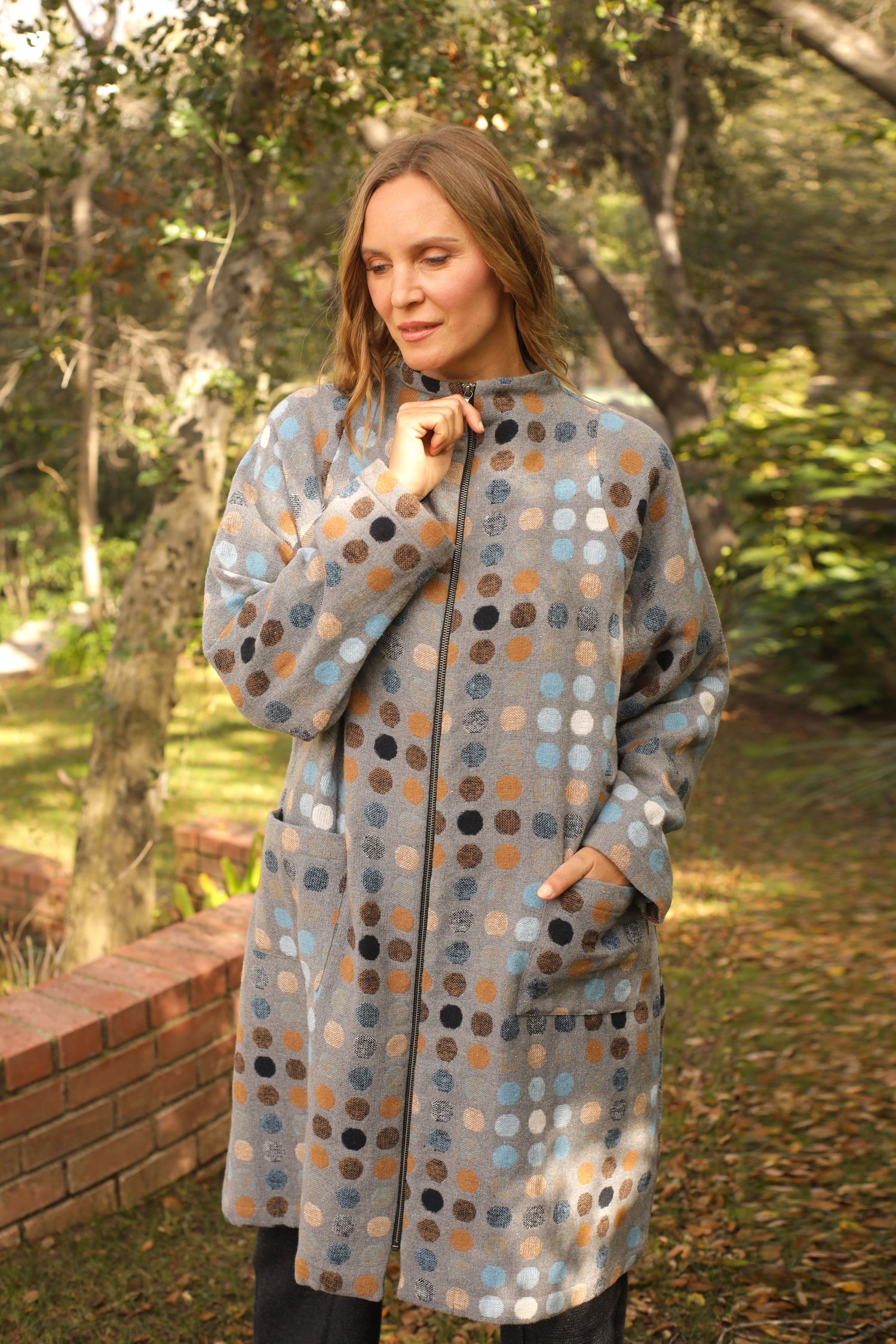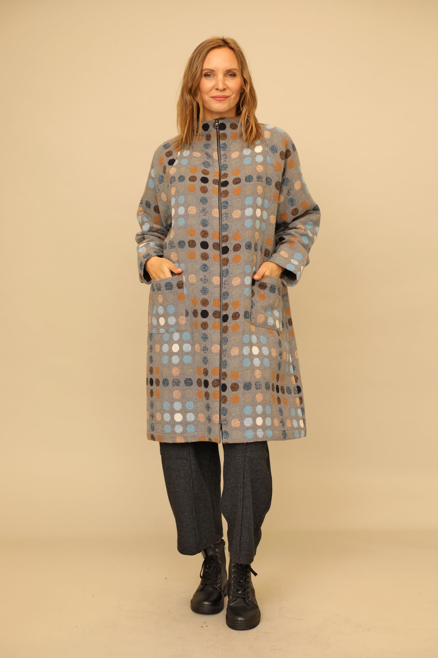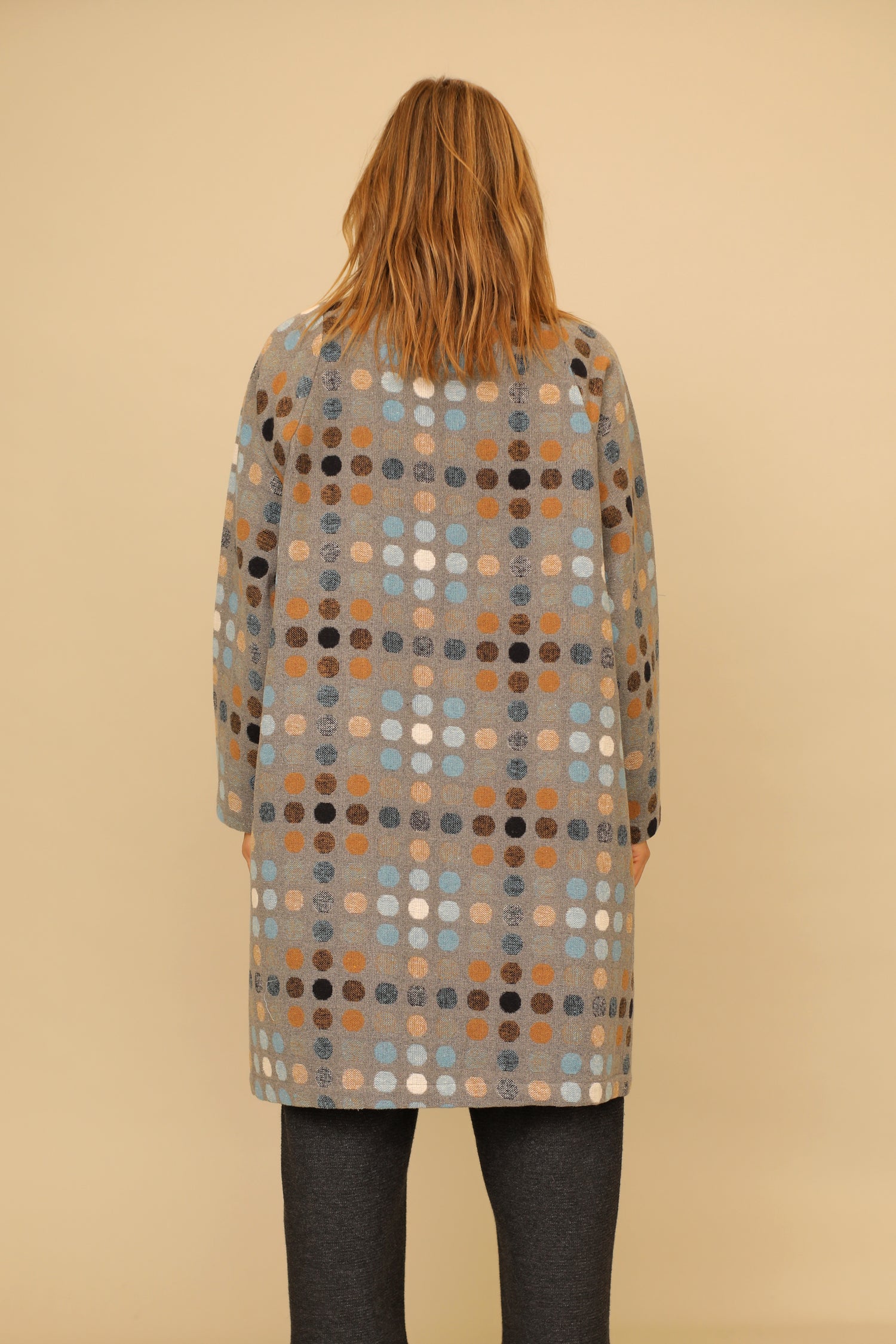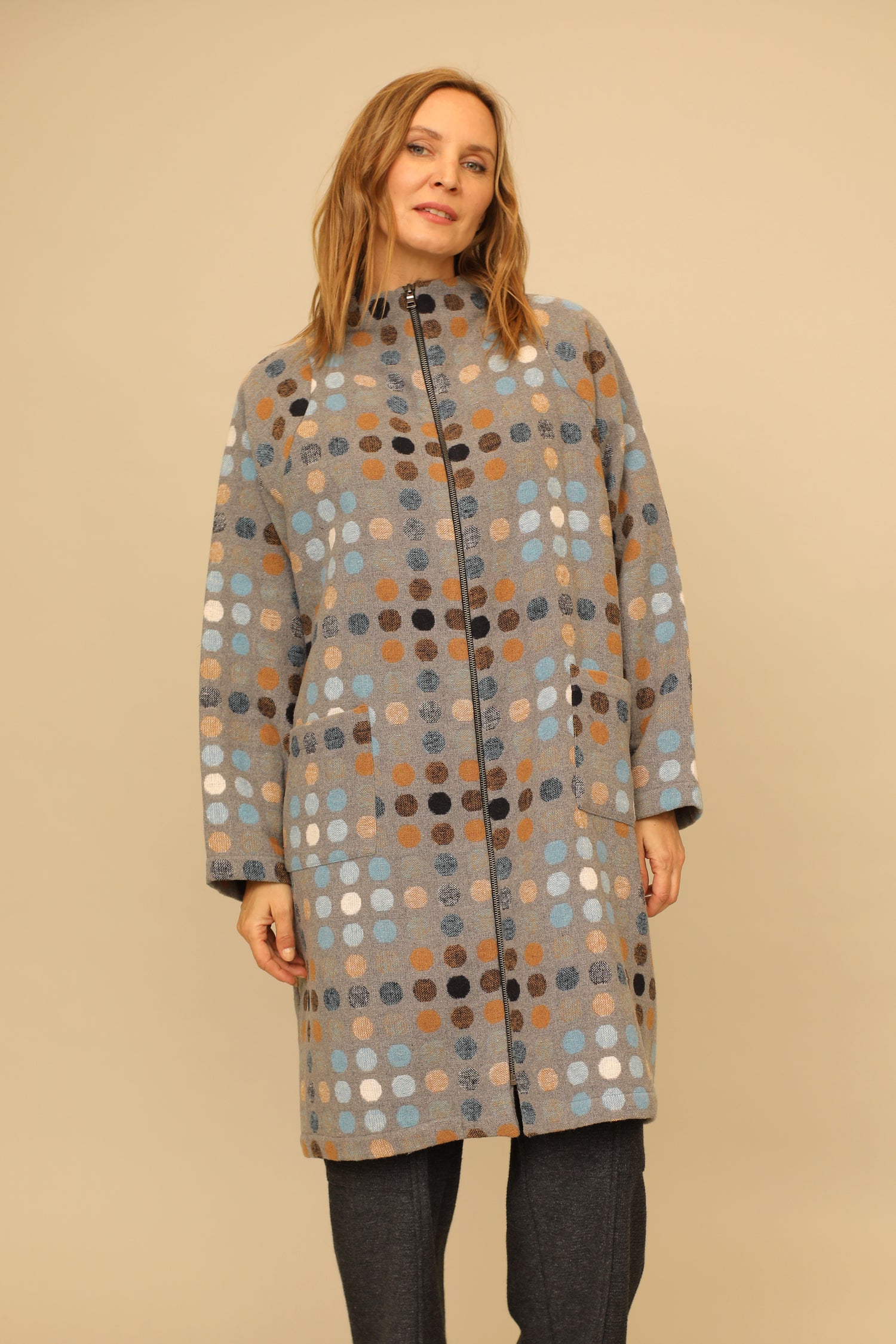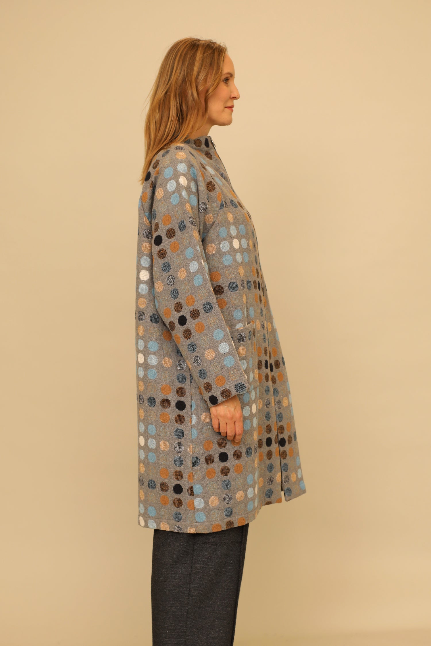 Transform instantly and effortlessly in our zip up long raglan Scarlett Jacket. Offering both warmth and a striking appeal with its sleek design of a straight hem in a boxy silhouette and front patch pockets, all curated in our multicolor dot woven fabric for a practical yet lush wardrobe essential.