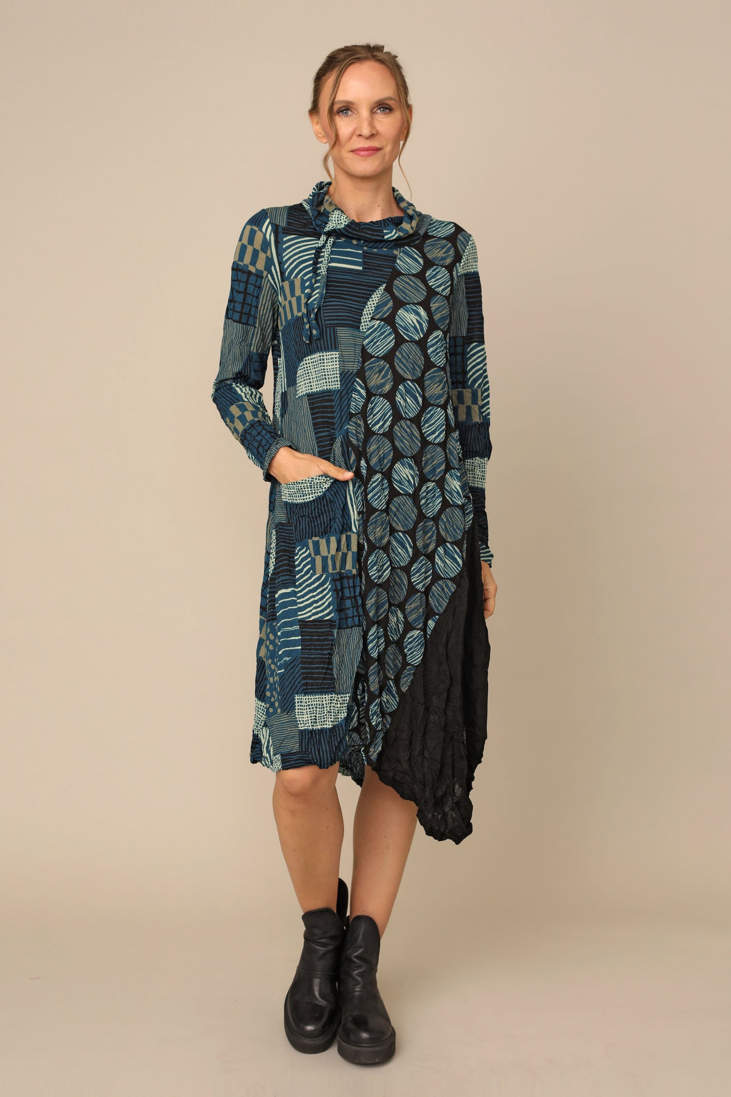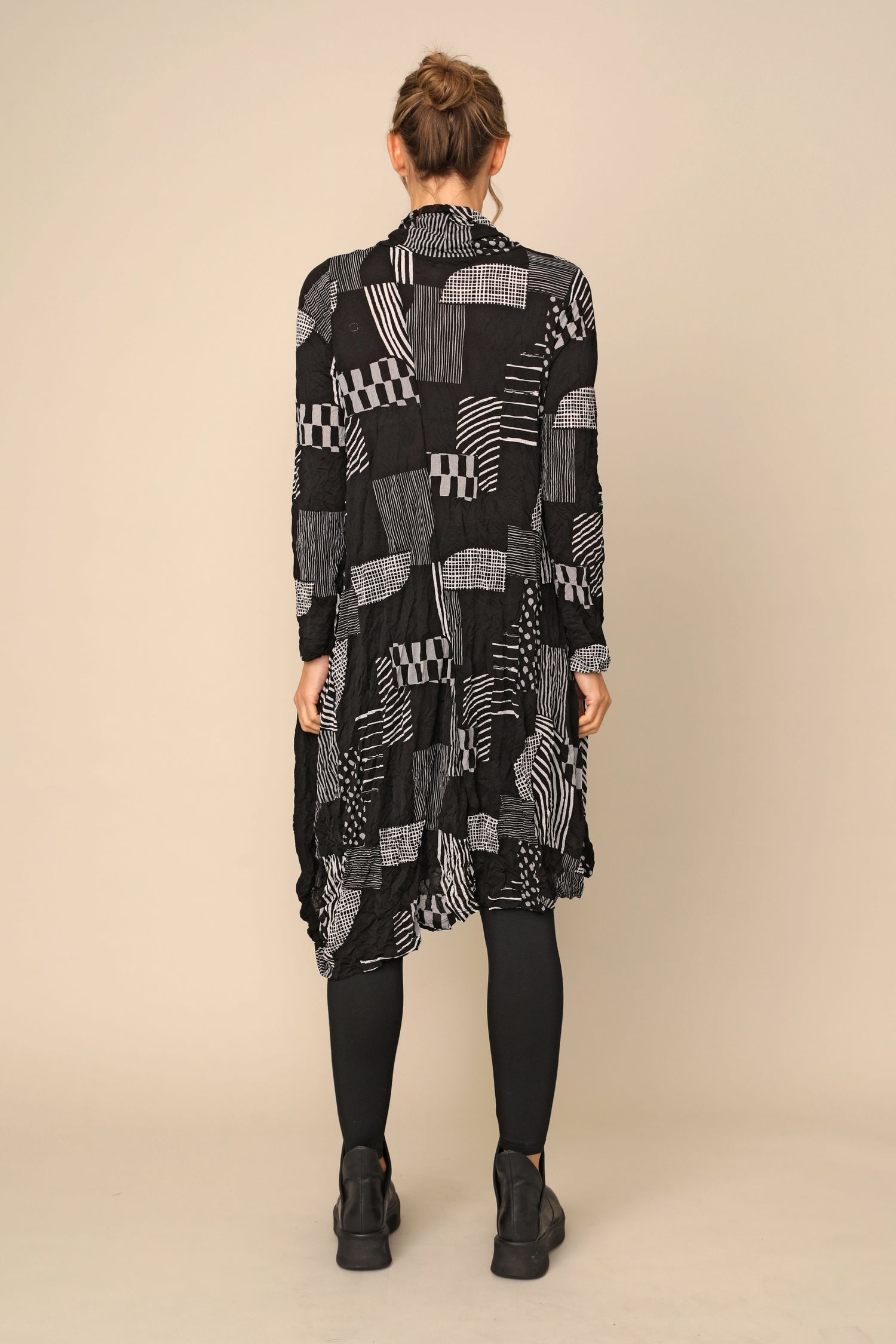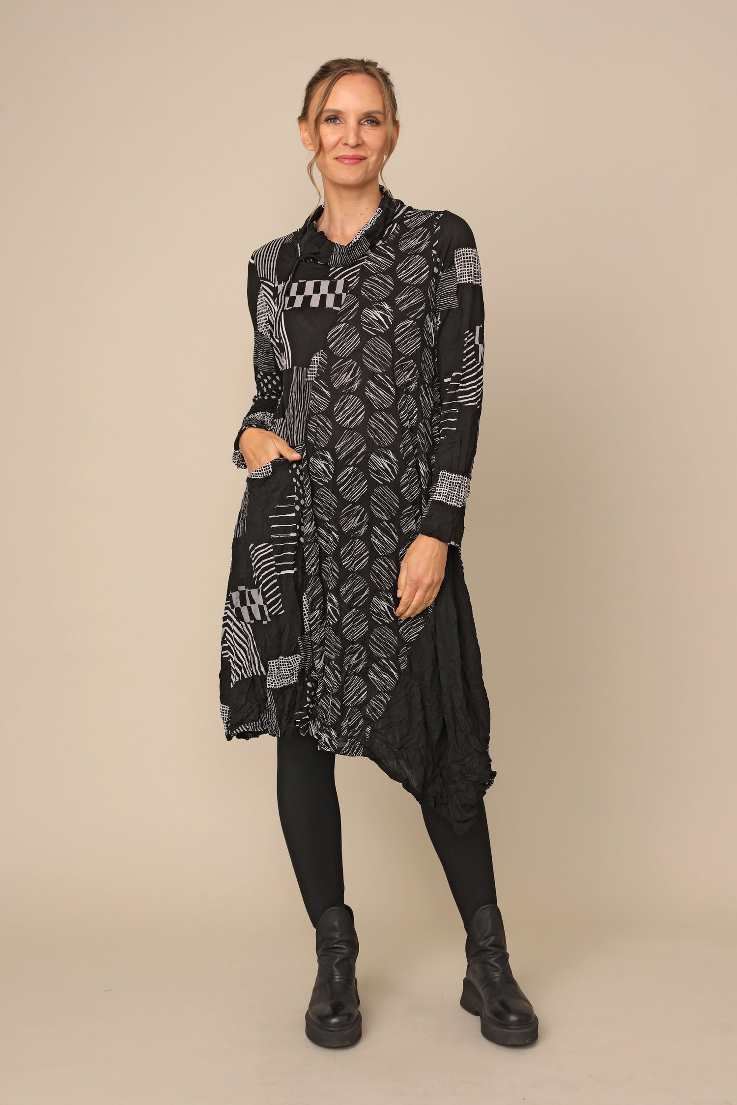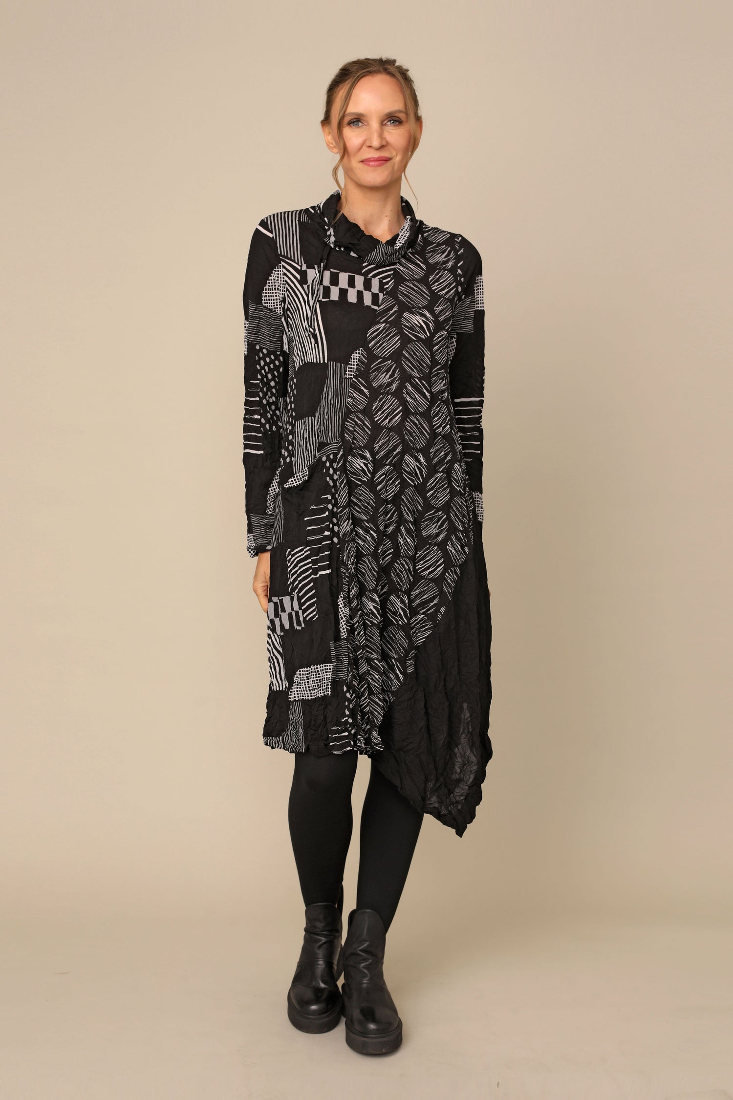The long-sleeved Siena Dress is the ultimate crinkle mesh staple, designed in thoughtful creativity with its draw stringed turtle neckline, in seam pocket, asymmetrical hem in an A-line silhouette. Alongside gorgeous color blocking of crinkle mesh solid black, crinkle mesh hash and crinkle mesh dot for an easy throw-on effortless statement.
