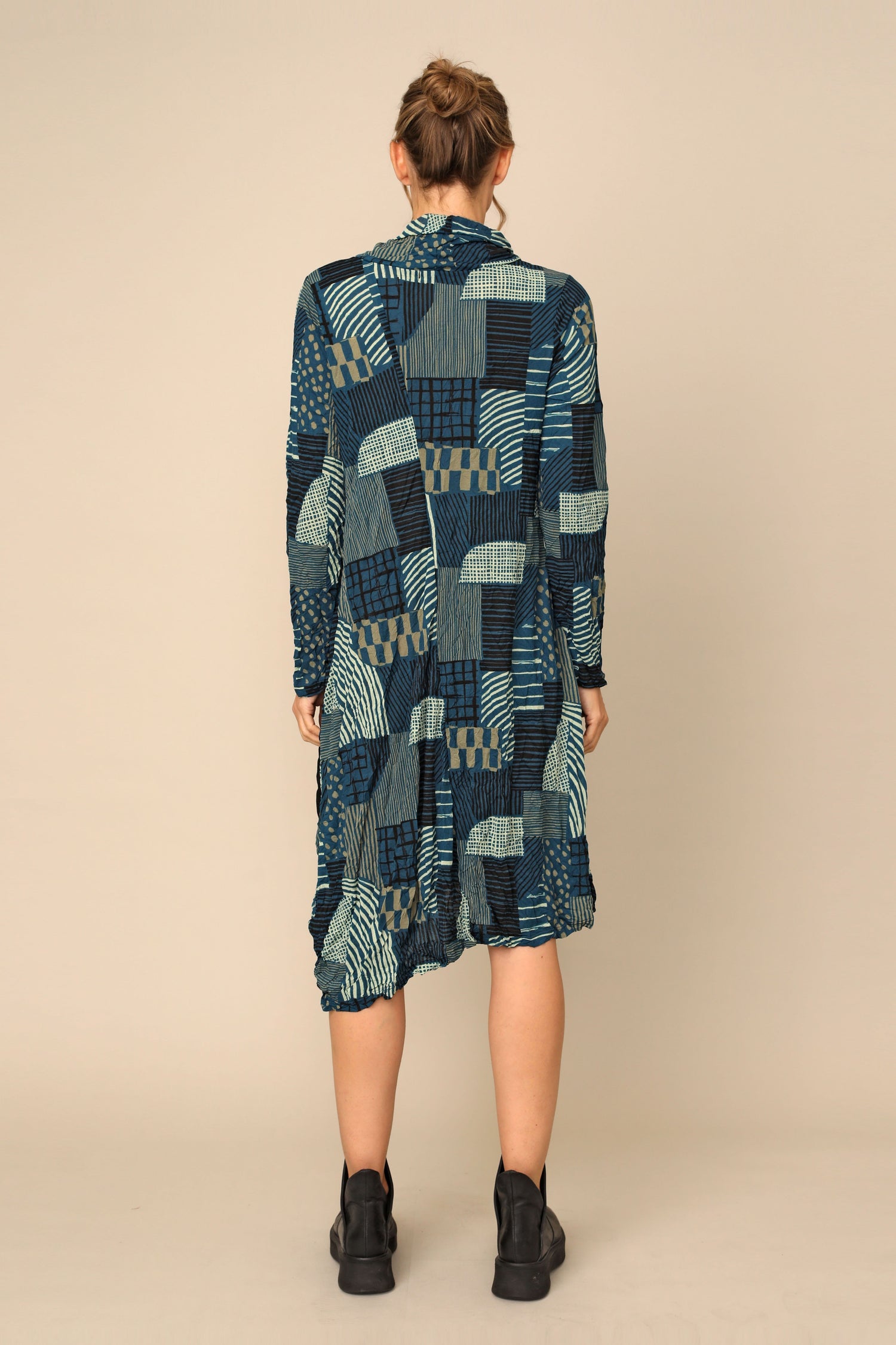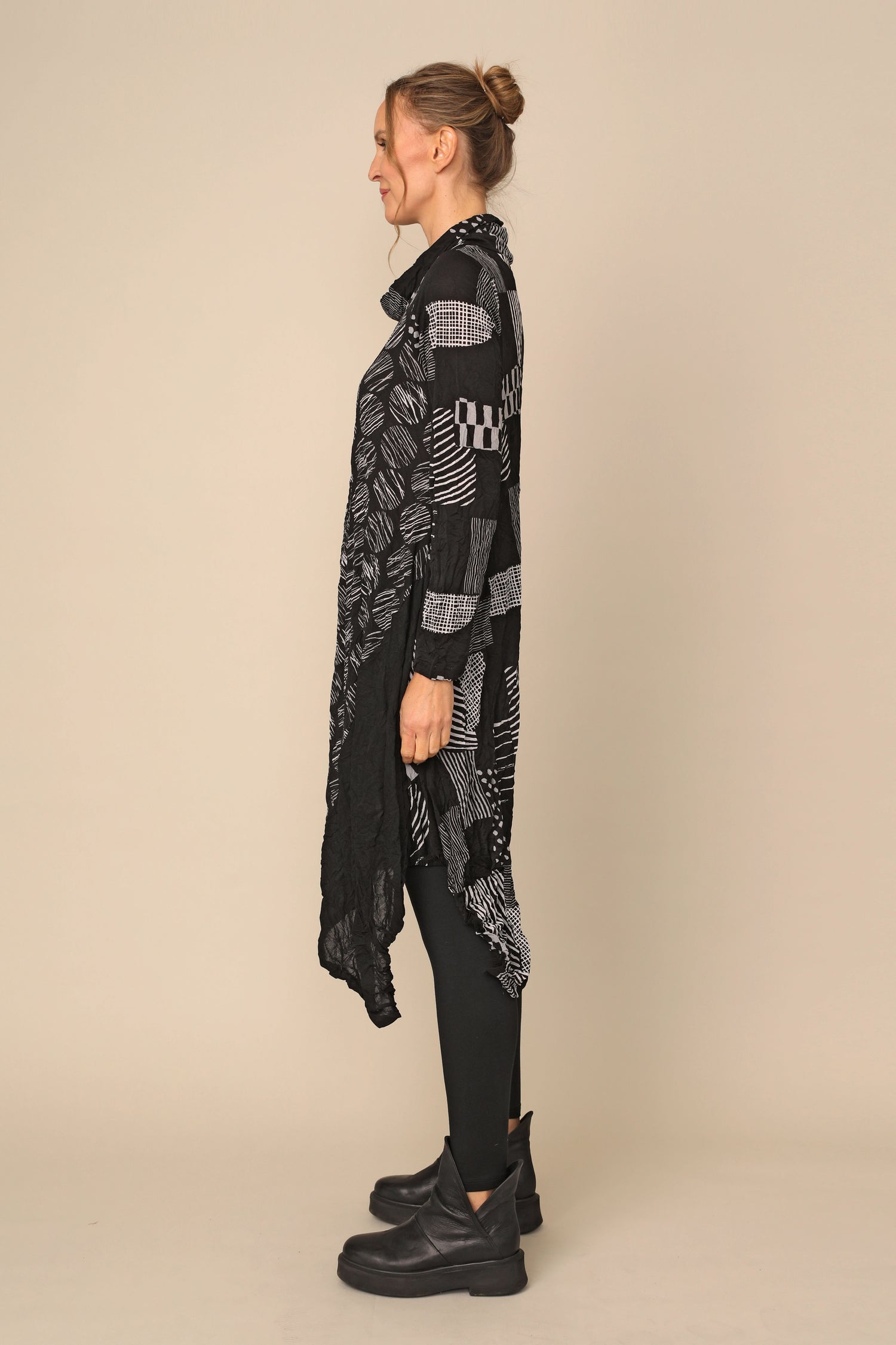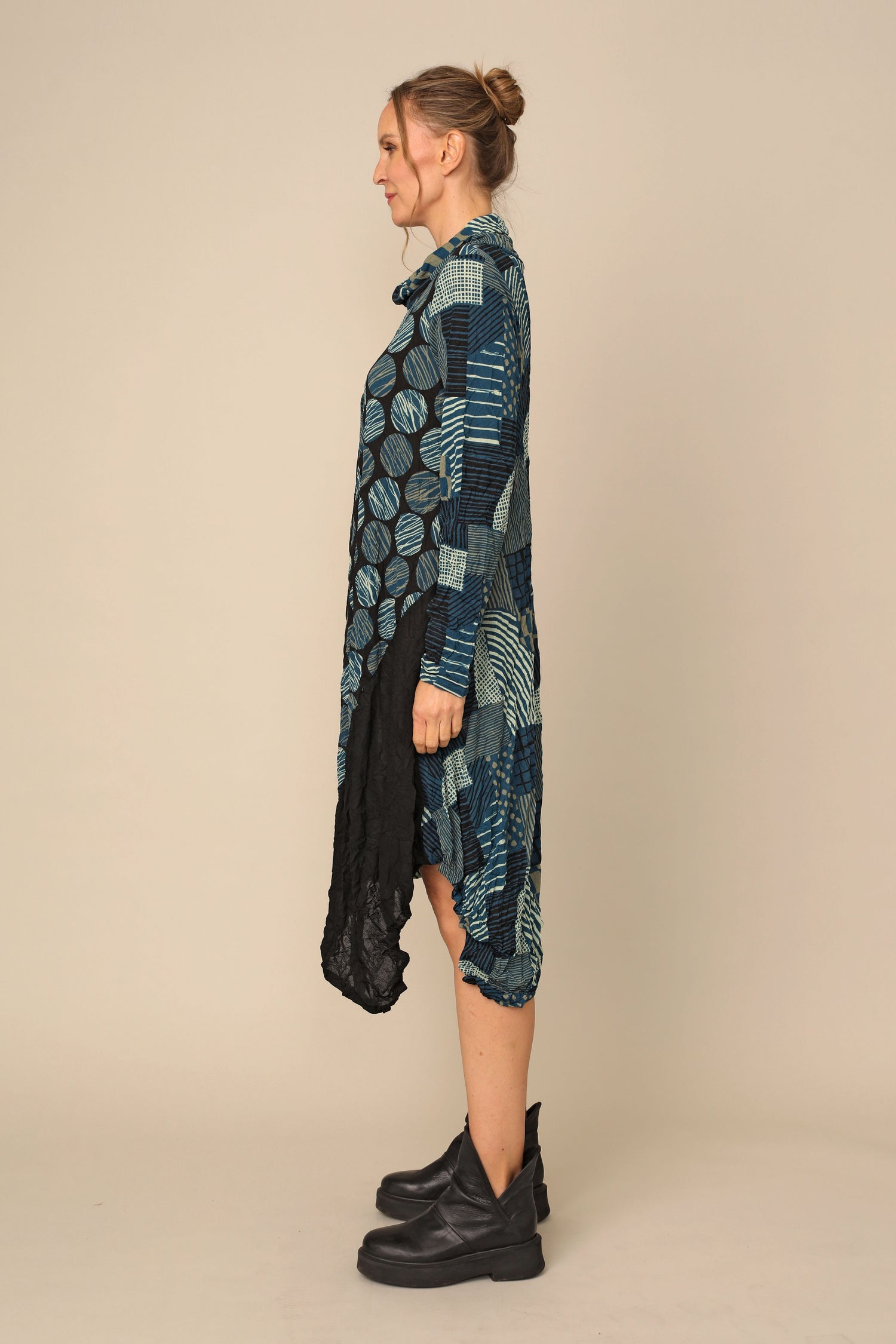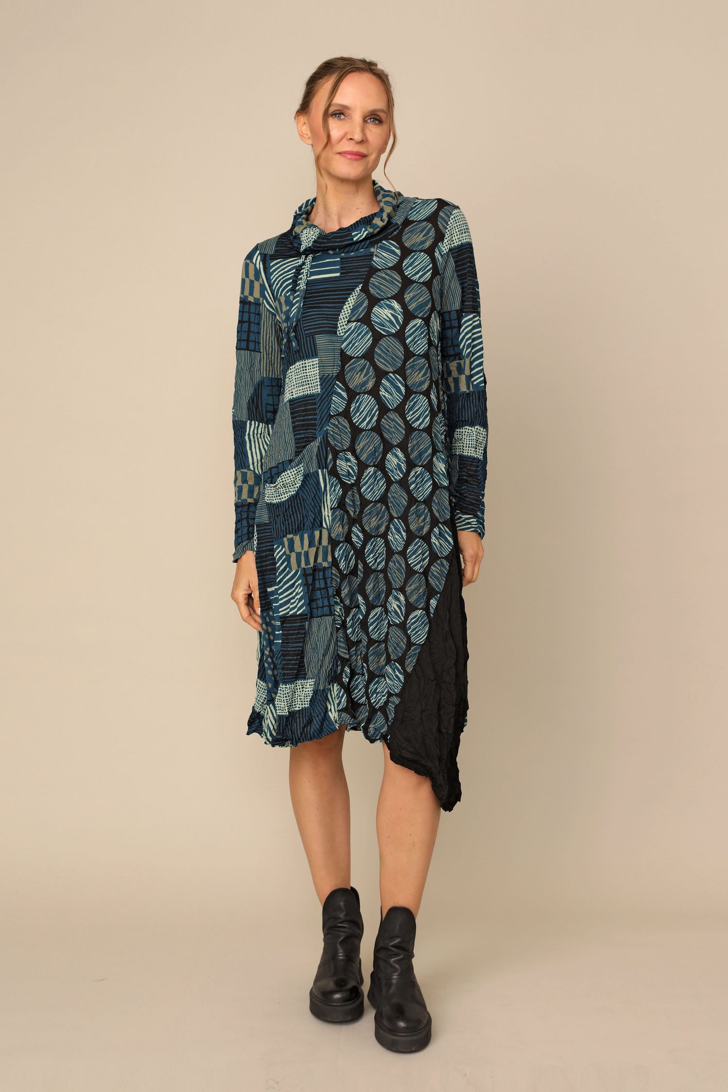 The long-sleeved Siena Dress is the ultimate crinkle mesh staple, designed in thoughtful creativity with its draw stringed turtle neckline, in seam pocket, asymmetrical hem in an A-line silhouette. Alongside gorgeous color blocking of crinkle mesh solid black, crinkle mesh hash and crinkle mesh dot for an easy throw-on effortless statement.