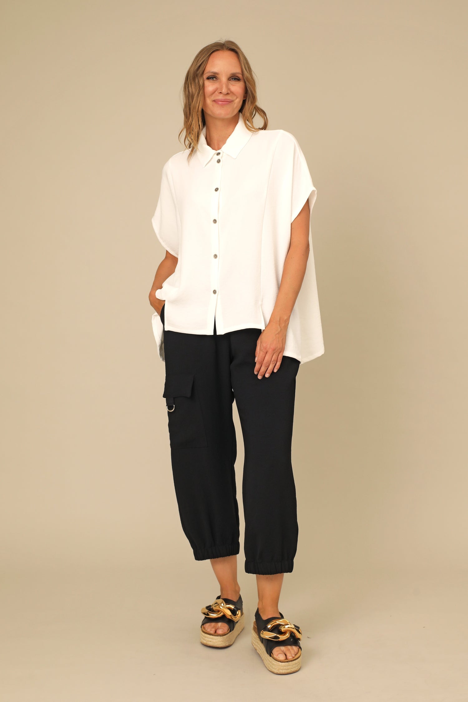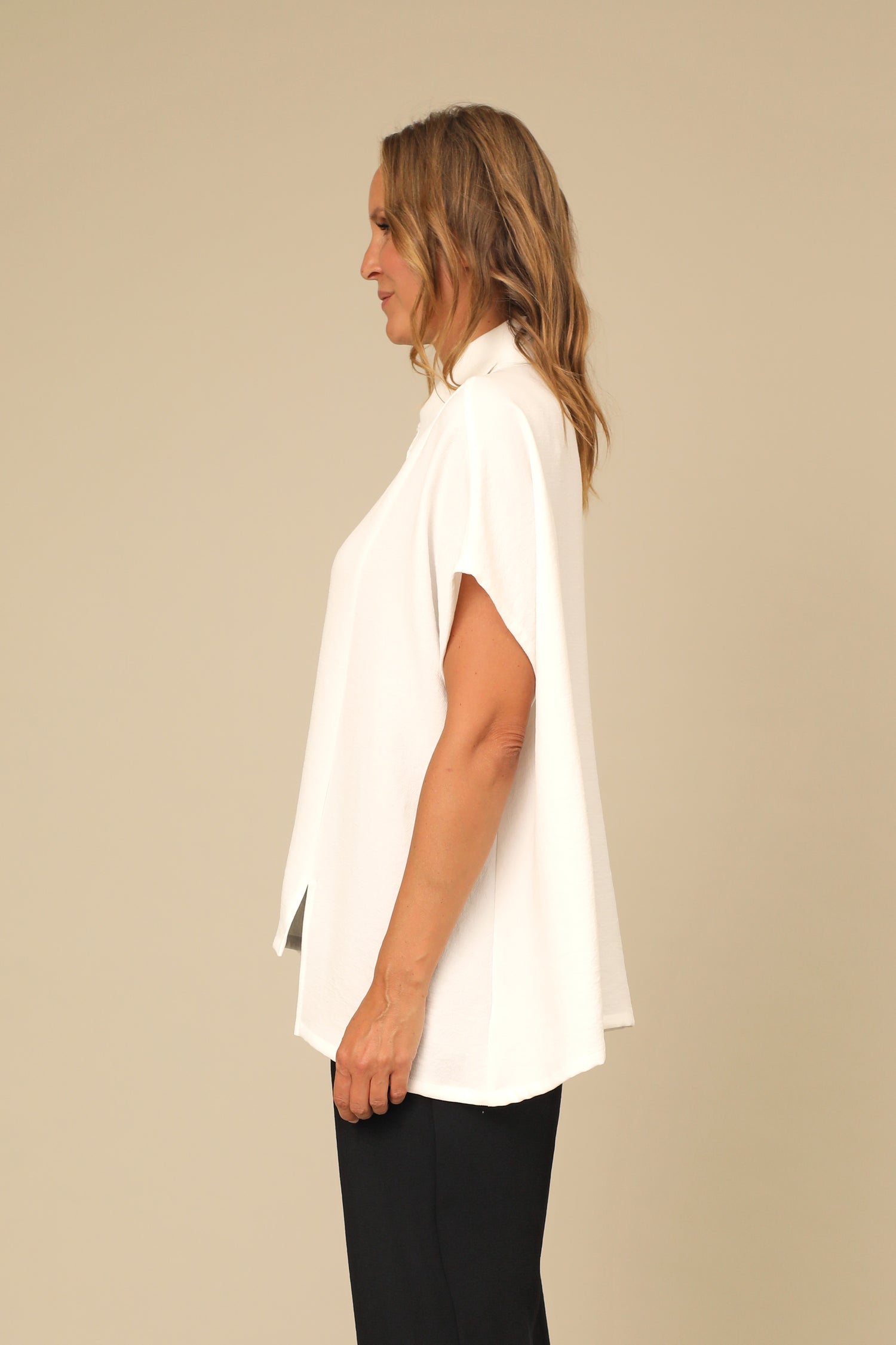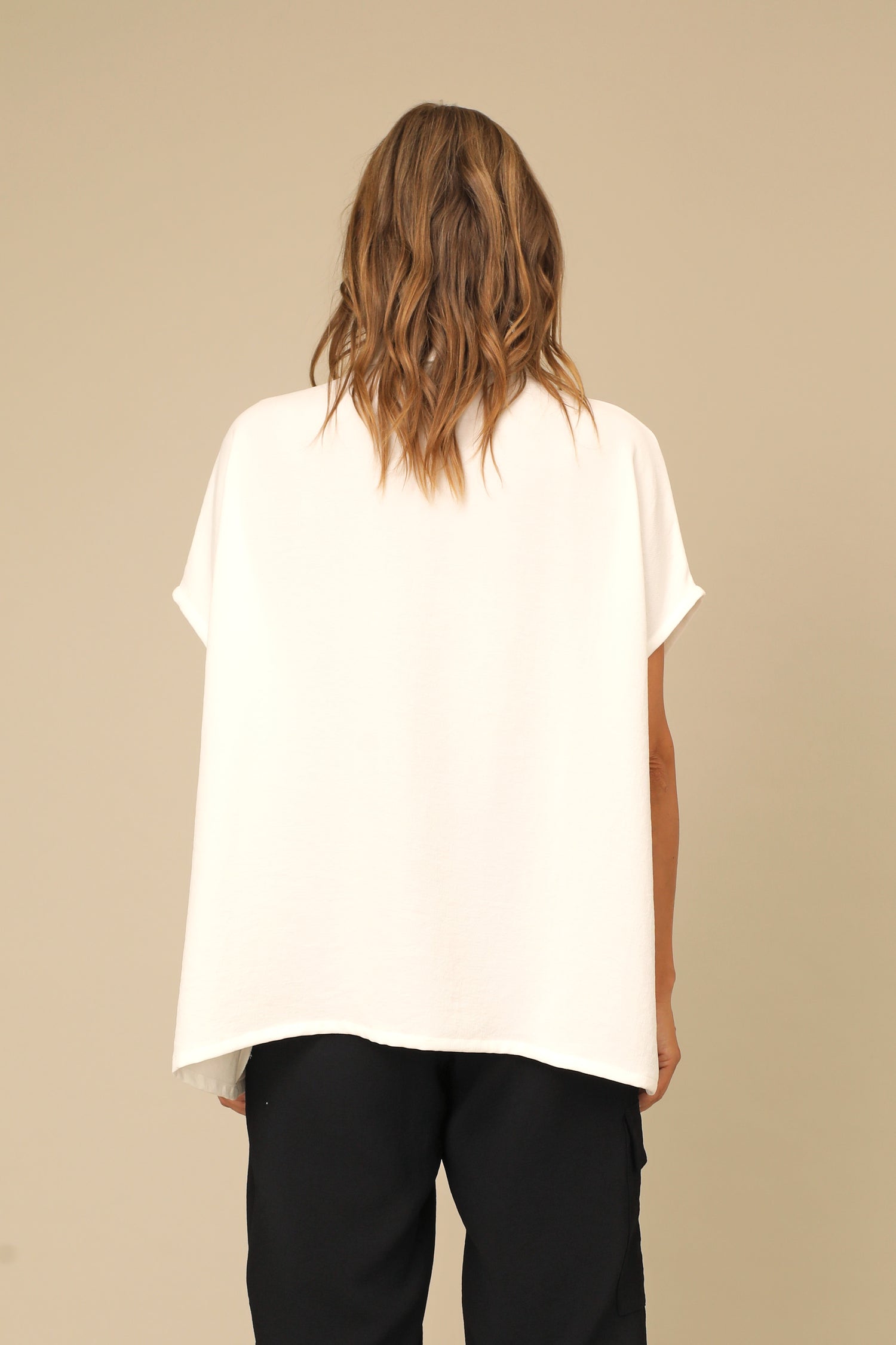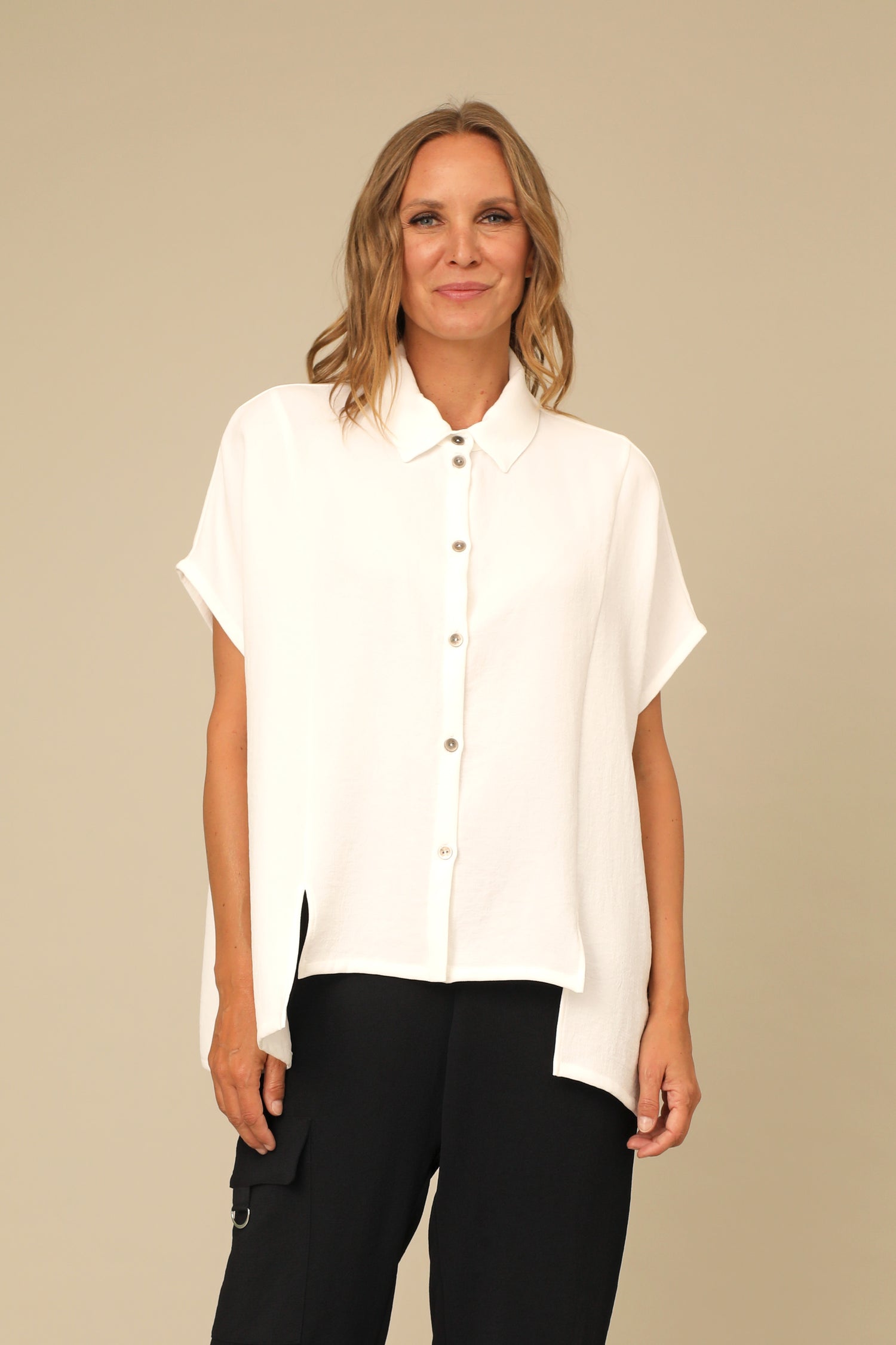 The chic Sylva Shirt brings an elevated breath of fresh air in our Osaka Woven fabric. This collared button up features slitted high low hem and relaxed dolman sleeves, all shaped within a beautifully crisp boxy silhouette for sophisticated appeal.