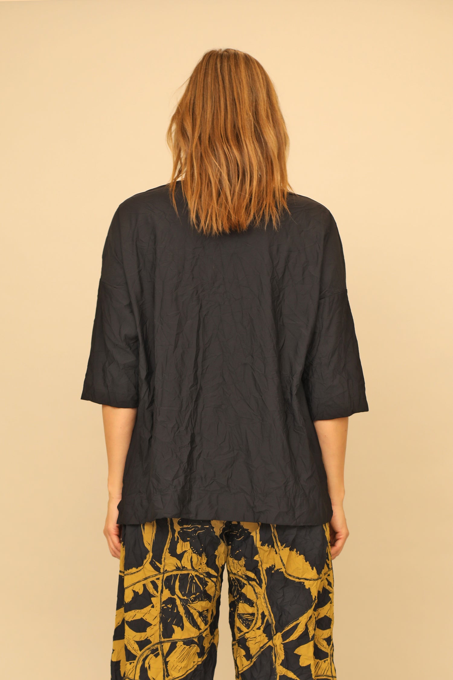 Sculpted by crinkled texture and designed for elegance no matter where you traverse this season. The travel friendly Thea Top will never fail to present a show stopping look when it comes to its attractive pleat detailing with an asymmetric hem, alongside a front patch pocket with drop shoulder elbow sleeves and a rounded neckline.