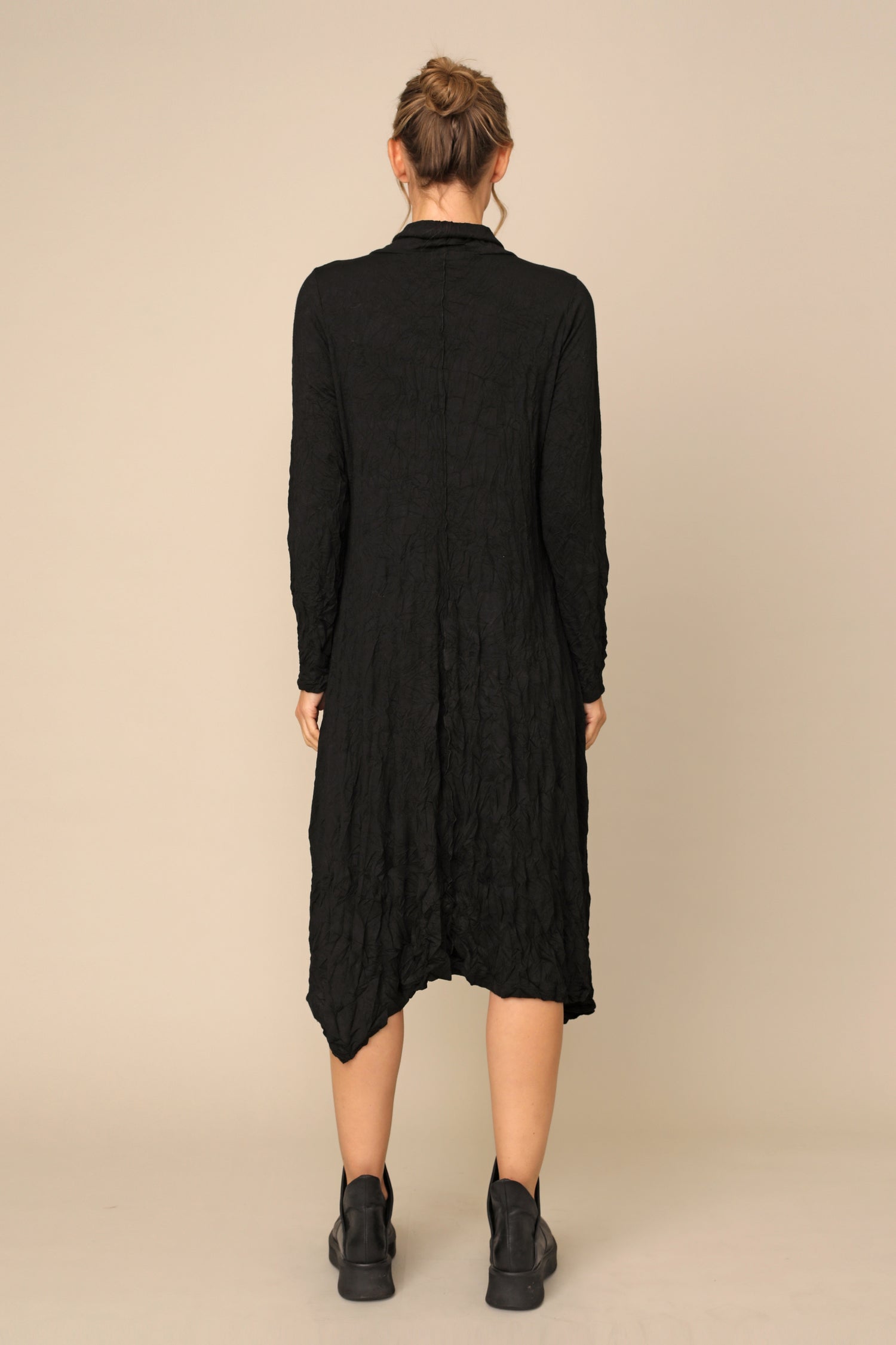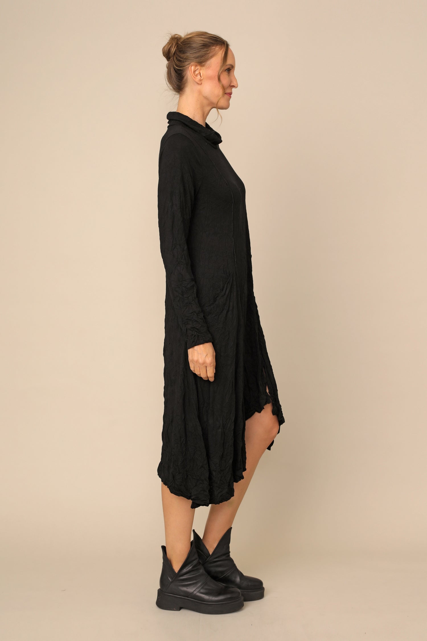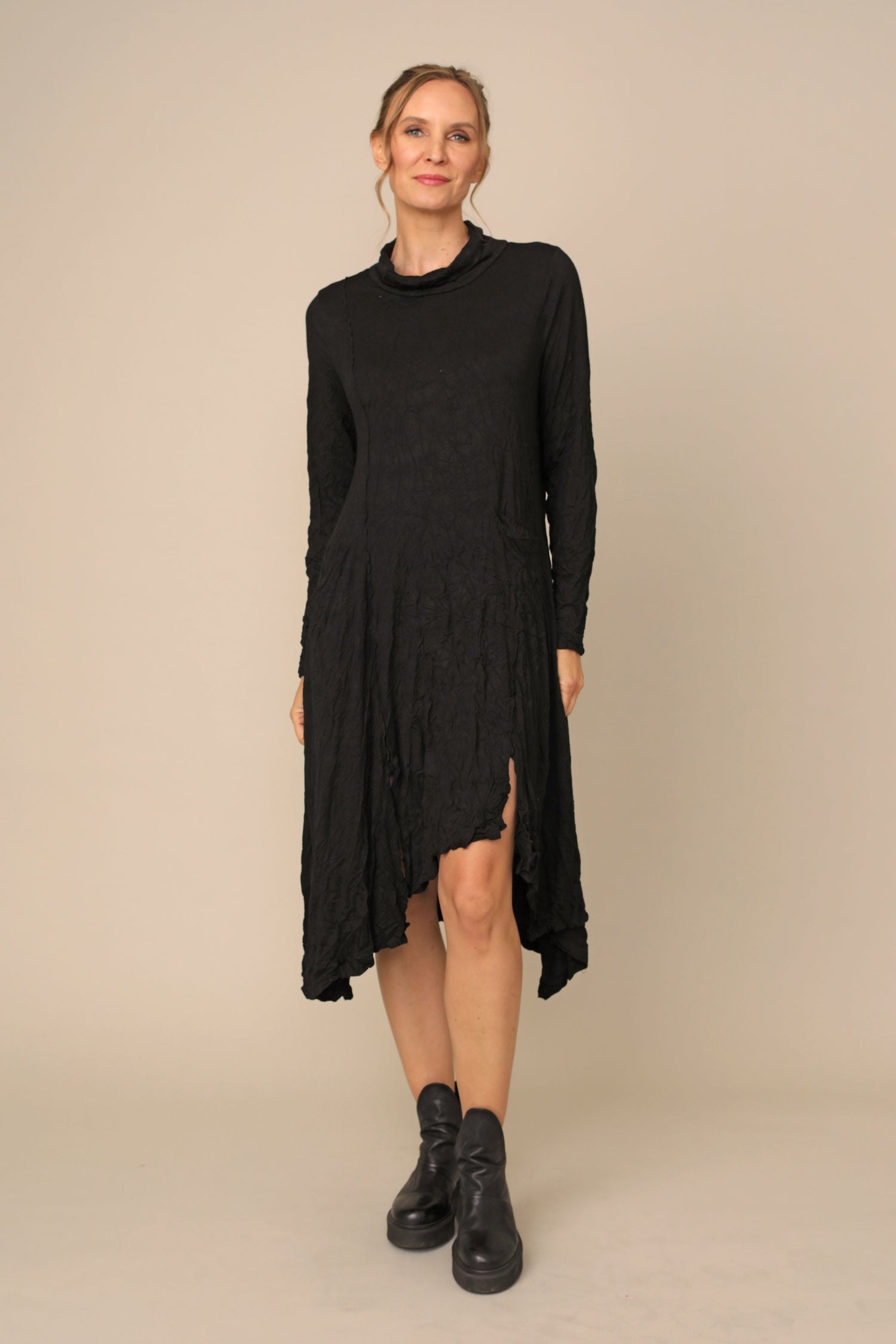 Whether you are across town or across the country, the travel friendly recycled crinkle jersey Varly Dress will be your new favorite staple for the season. Designed with a cowl neckline and long-sleeves with an asymmetrical hemmed A-line fit, the bold seam details elevate the inseam and front patch pocket.
