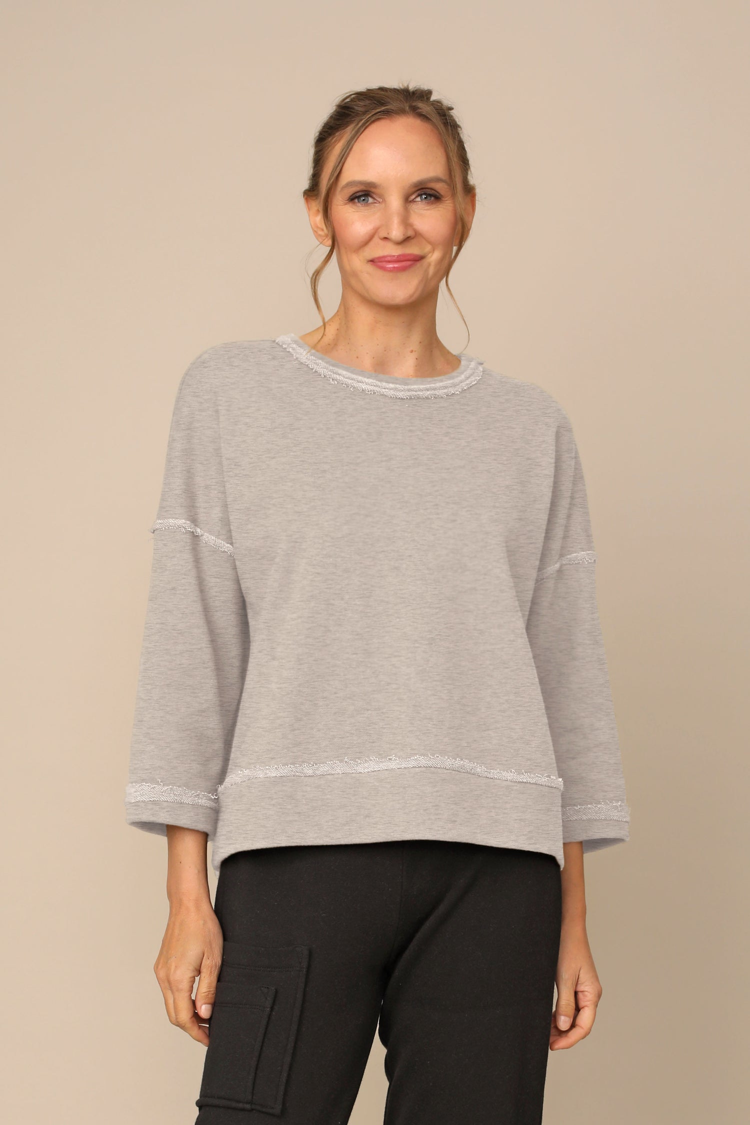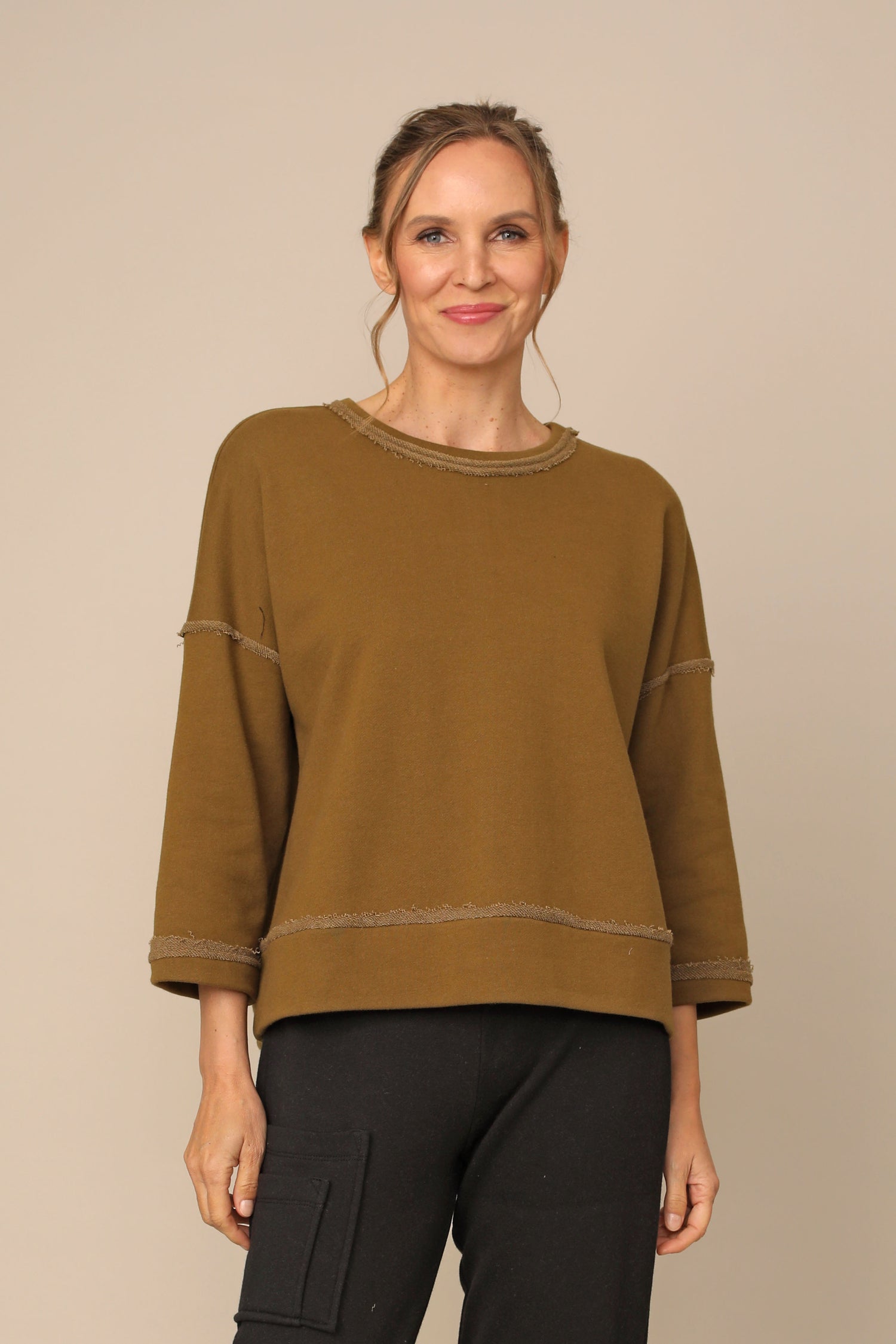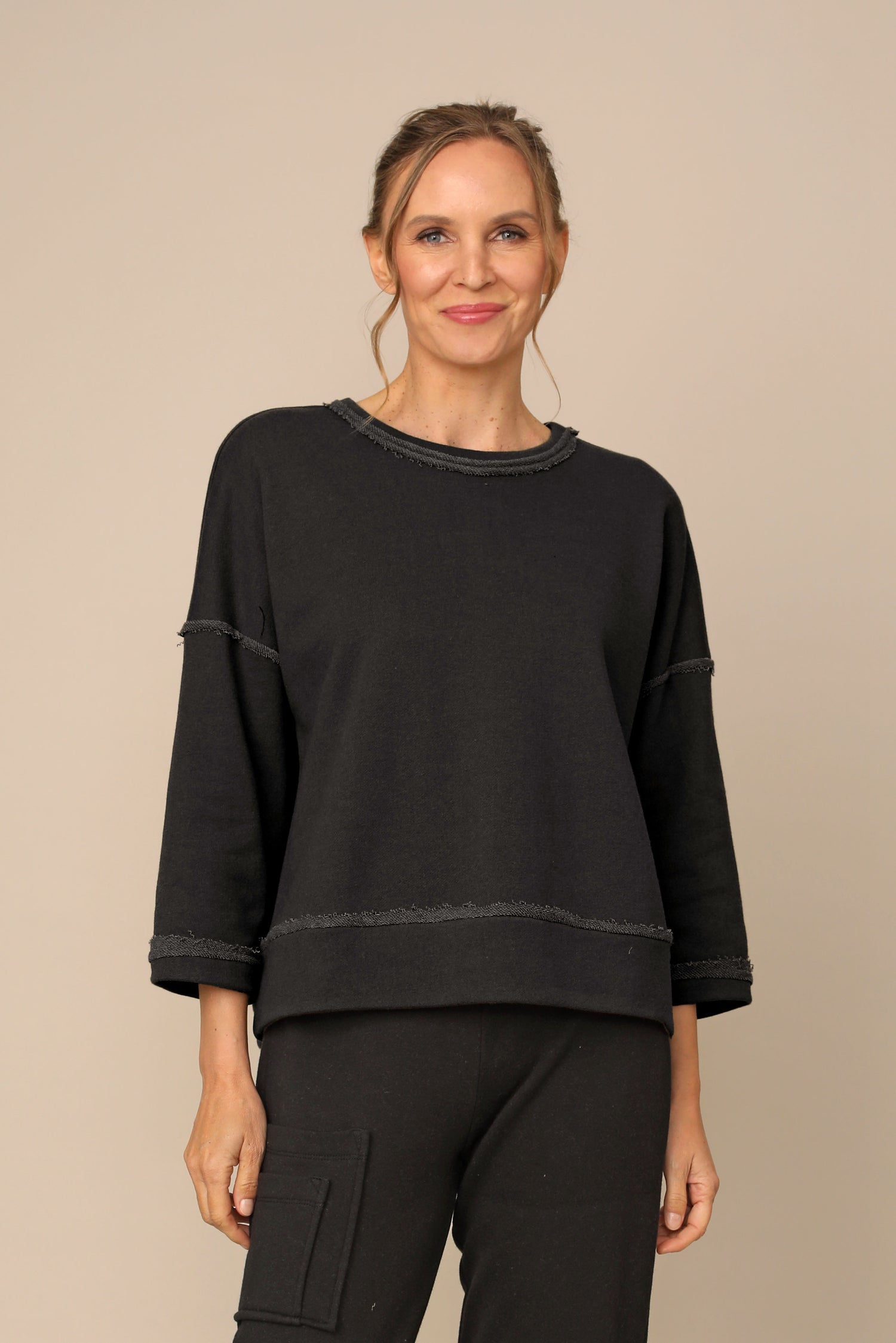 The Vida Top showcases a round neckline, drop shoulder ¾ sleeves, and a boxy silhouette. Finished with raw edge detailing and a straight hem, crafted in french terry fabric for everyday comfort.