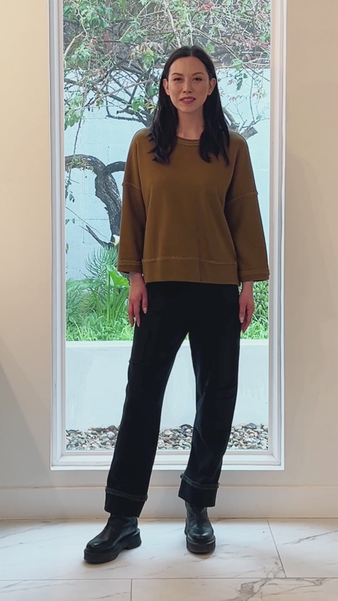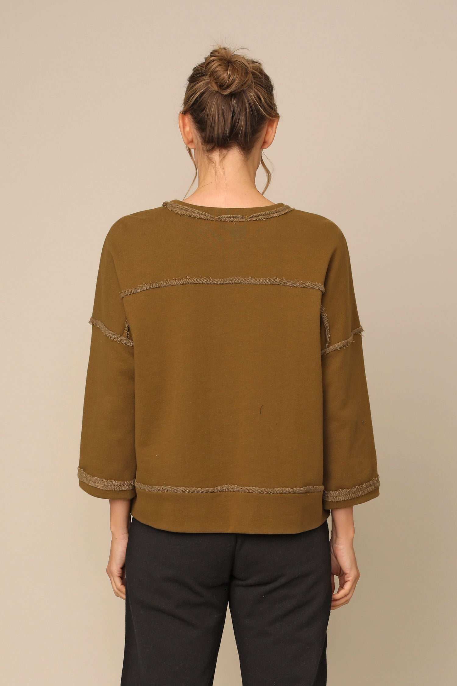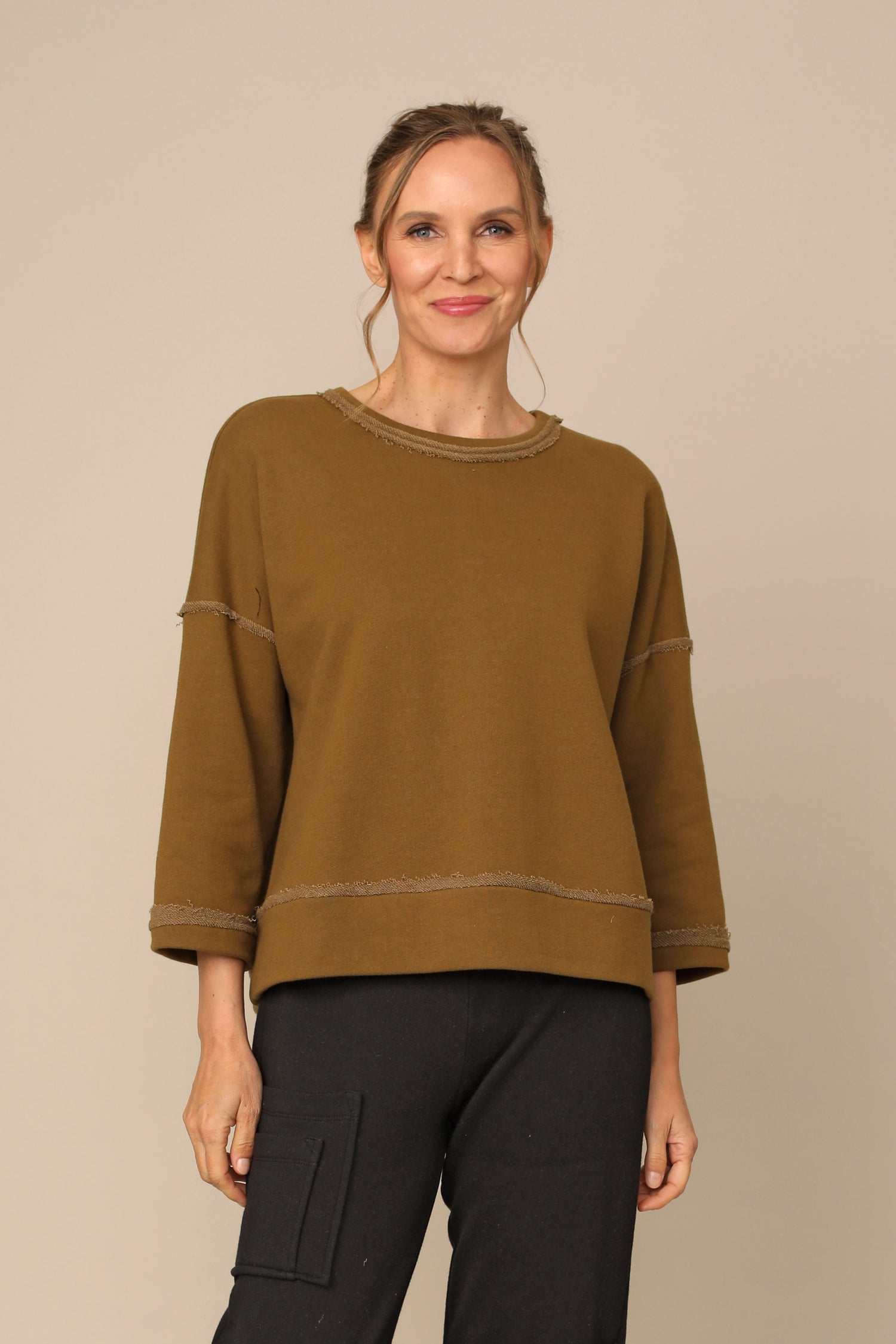 The Vida Top showcases a round neckline, drop shoulder ¾ sleeves, and a boxy silhouette. Finished with raw edge detailing and a straight hem, crafted in french terry fabric for everyday comfort.