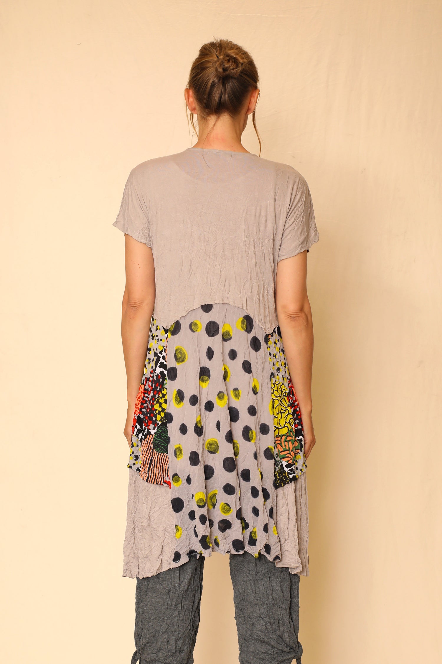 The Vivian Vest is daring with the contrasting patterns and design of our mix fabrics of our funky dotted crinkle mesh and recycled crinkle jersey. Catered with two large buttons to fasten as the SharkBite hem flows freely while you strut with side patch pockets. The drop shoulder sleeves accent the appeal of its V-neckline, creating a quintessential layering piece all spring long.