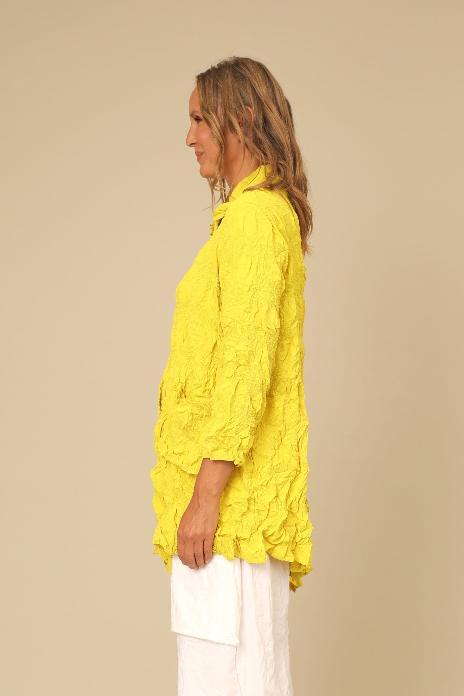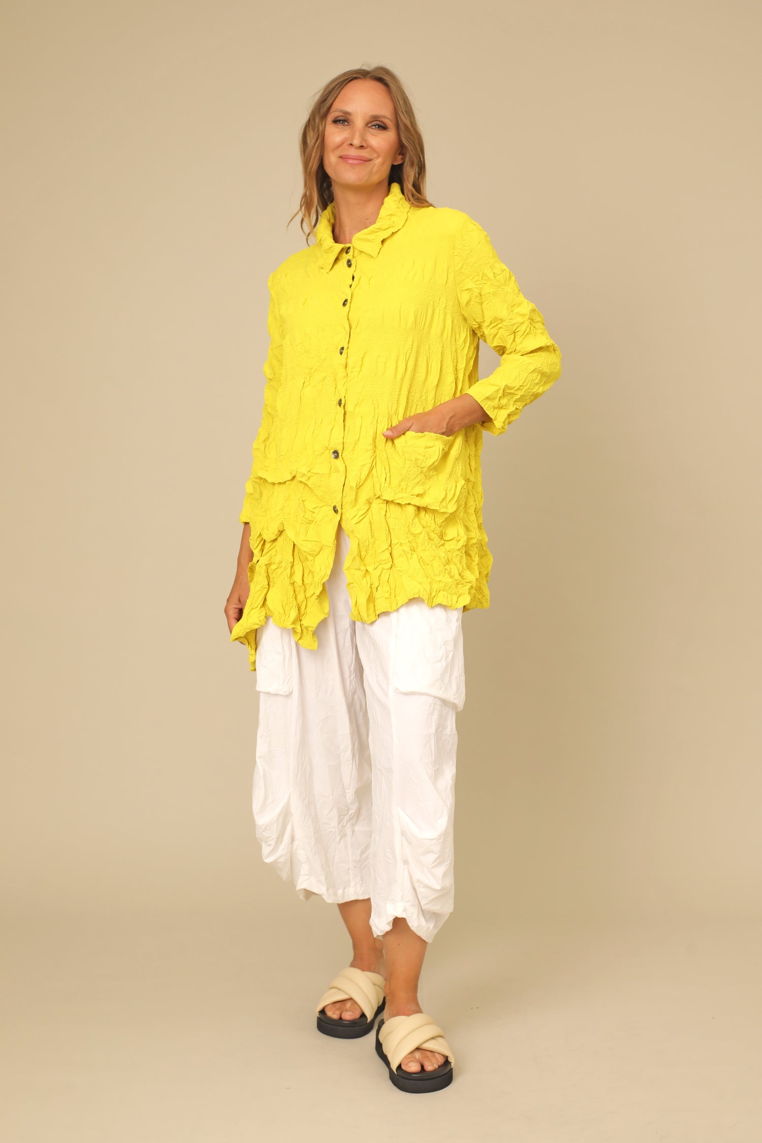 Boldly playful, beautifully tailored. The button up Willamina Shirt is versatile must have when it comes down to its ¾ sleeves and collar in our crinkled embossed woven fabric. With its asymmetric hem, A-line silhouette, front pleats, and inseam pocket, this shirt is all about effortless elegance in a bold unique way. Whether it be in eye catching Citrus or classic White