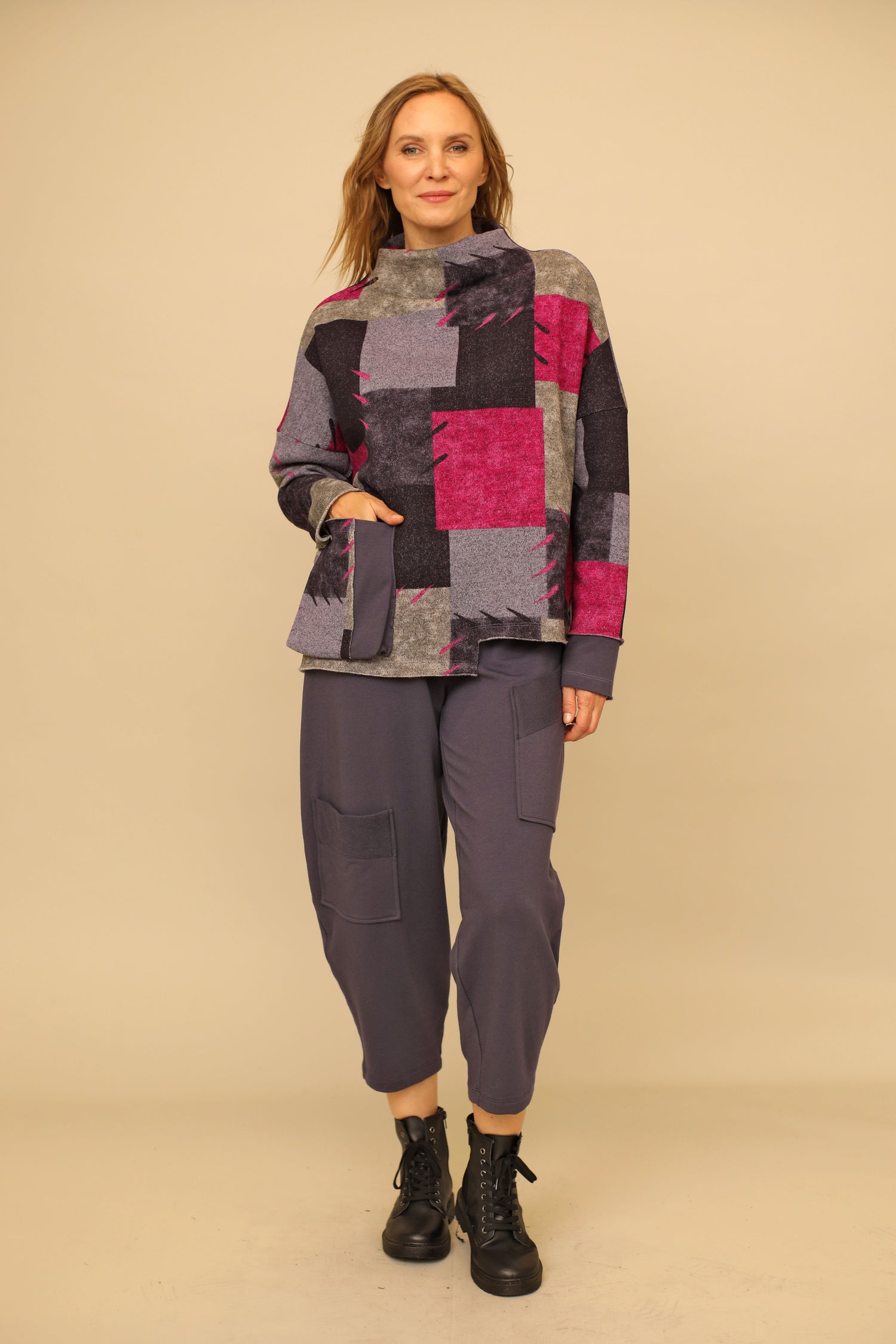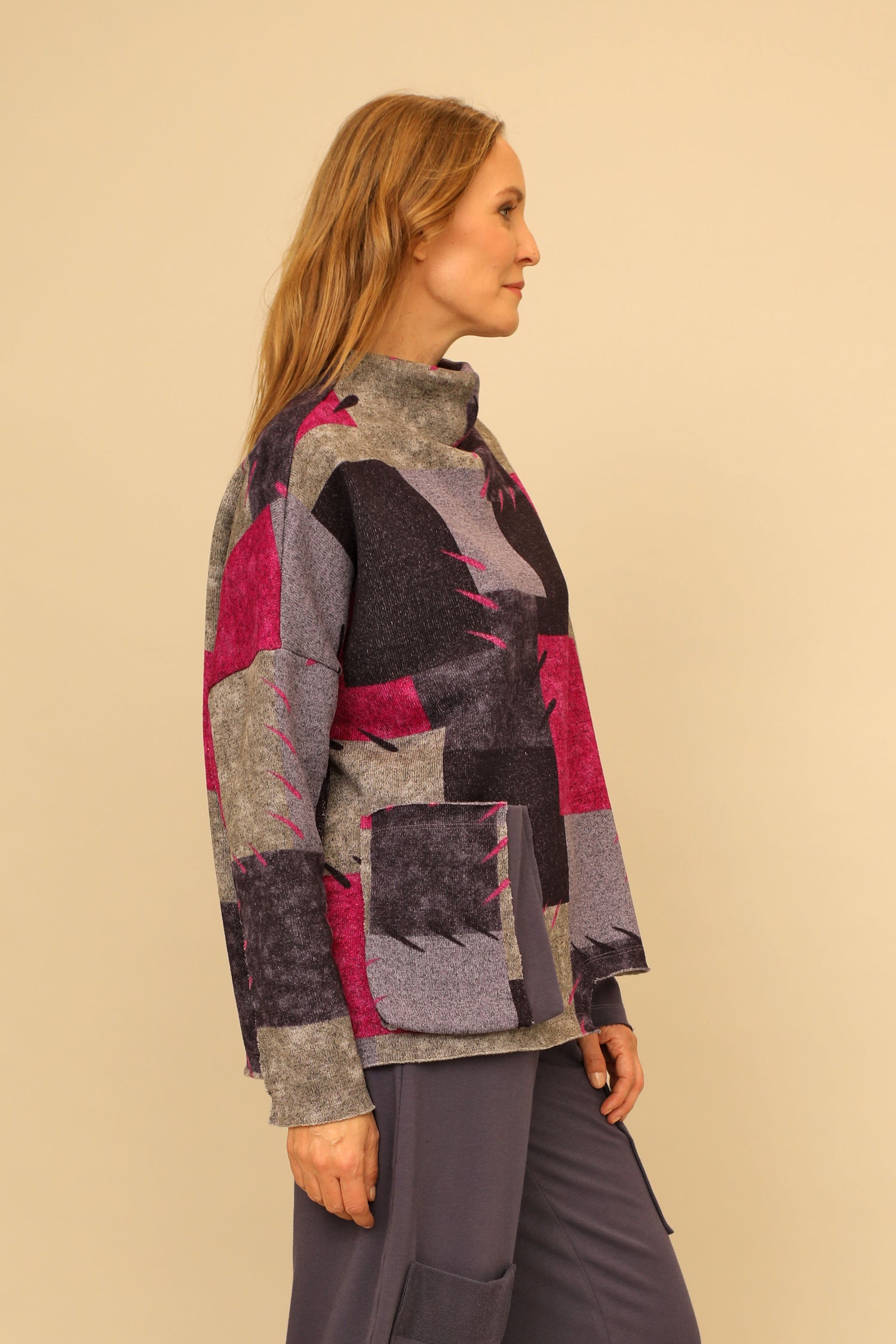 Illuminate any room with the Zinnia Top. Its mock neckline and drop shoulder sleeves offer a touch of charm alongside the raw edge style lines, while the asymmetric hem and solid French terry contrasts on the long sleeves, cuffs, and front patch pocket add a distinctive flair to its A-line fit.